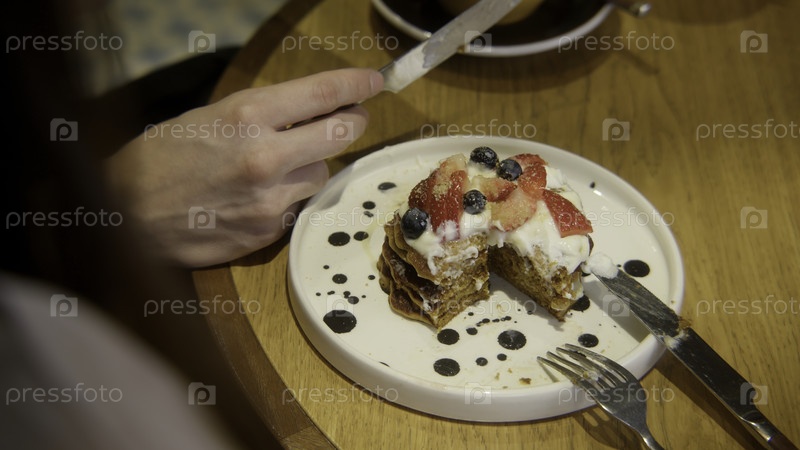 Ближе к еде вкусного торта с ягодами в ресторане.Сток-фильмы.Разделение десерта на торт с возлюбленным