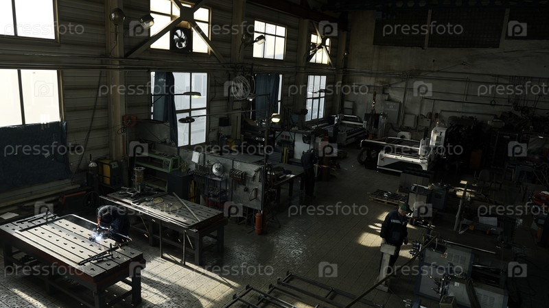 Детали завода по производству стали, производство металла.Креативное.Фабричная мастерская со сварщиками, выполняющими свою работу