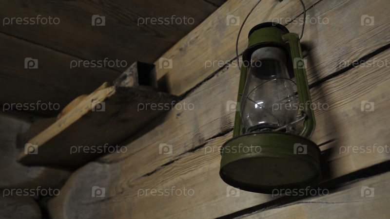 Древняя деревянная комната с винтажными предметами. СМИ. Внутри старого деревянного дома со старыми предметами. Античный фонарь, висит на деревянной стене дома