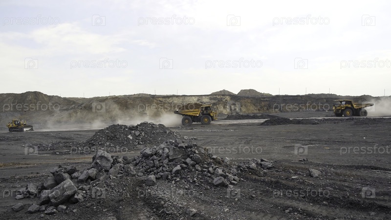 Экскаваторы и грузовики активно работают в пыльной шахте на открытом воздухе, ярко демонстрируя крупные промышленные операции