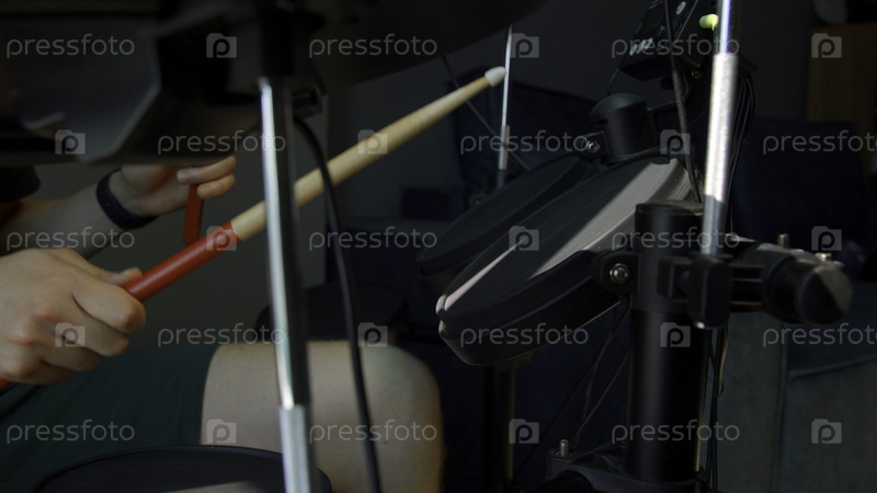 Репетиция перед концертом СМИ Человек, который играет на барабанах с помощью палок