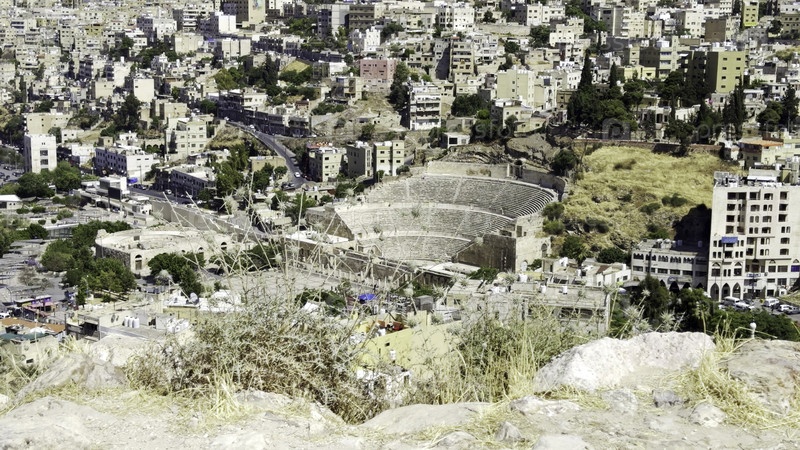 Панорамный вид на древнеримский театр, расположенный в современном городском ландшафте