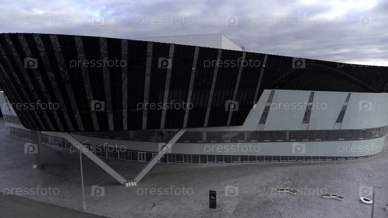 Вид с воздуха на необыкновенное здание со стеклянным фасадом. Фотосъемки. Летающий над выставочным центром или бизнес-центром
