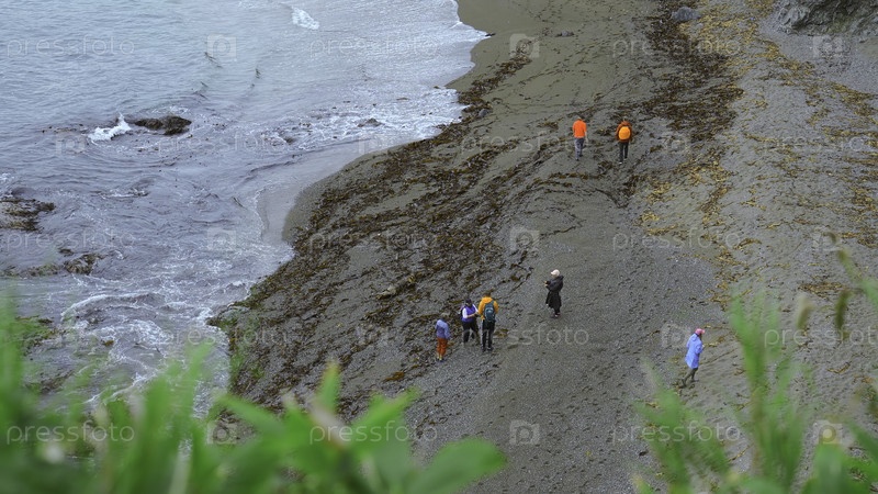 Группа туристов гуляет по берегу северного побережья.Клип.Туристы ходят по песчаному пляжу с водорослями в пасмурный день.Туристы на берегу с водорослями после шторма