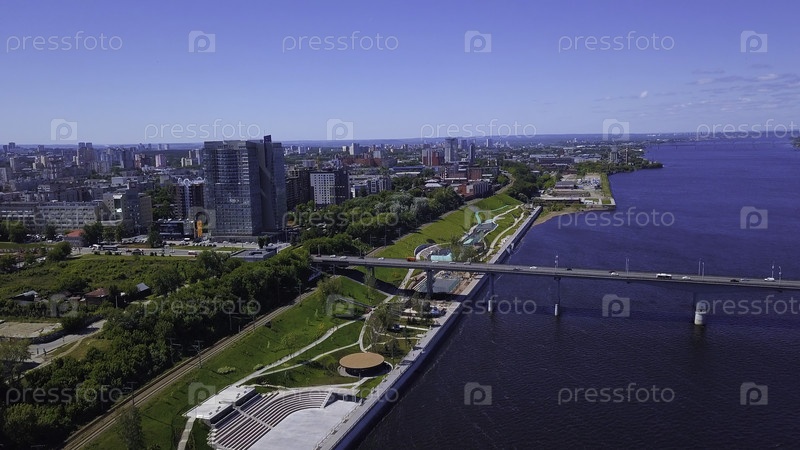 Вид из воздуха городского пейзажа с длинным мостом, пересекающим широкую реку. Клип. Летняя зеленая трава и набережная