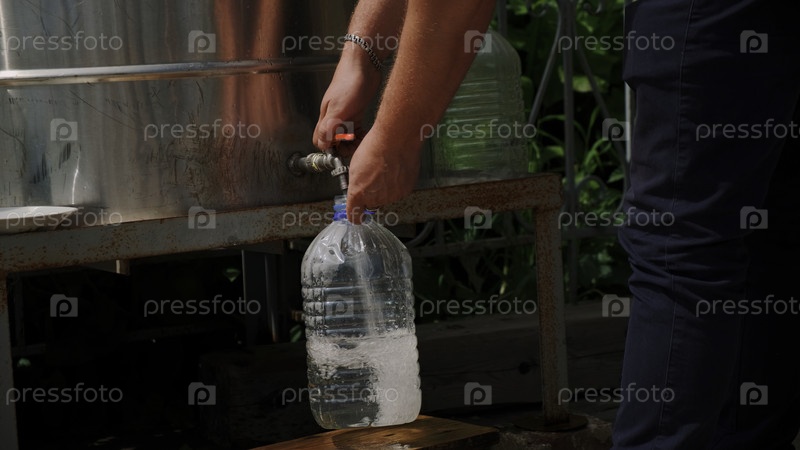 Мужчина с пятилитровой бутылкой набирает воду из специальной колонны