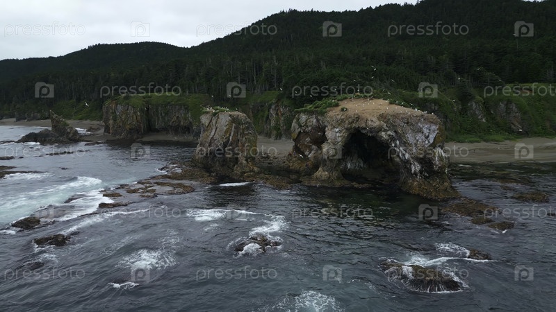 Вид сверху на побережье с эрозией скал и летающими птицами. Клип. Кинематический пейзаж со великолепным каменистым побережьем и рифами. Скала с эрозией у северного побережья с летящими чайками