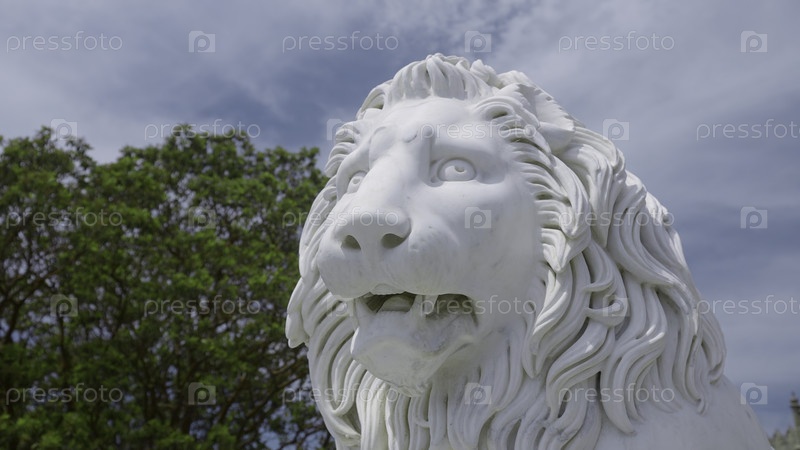 Скульптура белого льва летом. Действие. Статуя белого льва на фоне зеленого дерева и синего неба. Натуралистическая статуя белого льва в солнечный летний день в парке