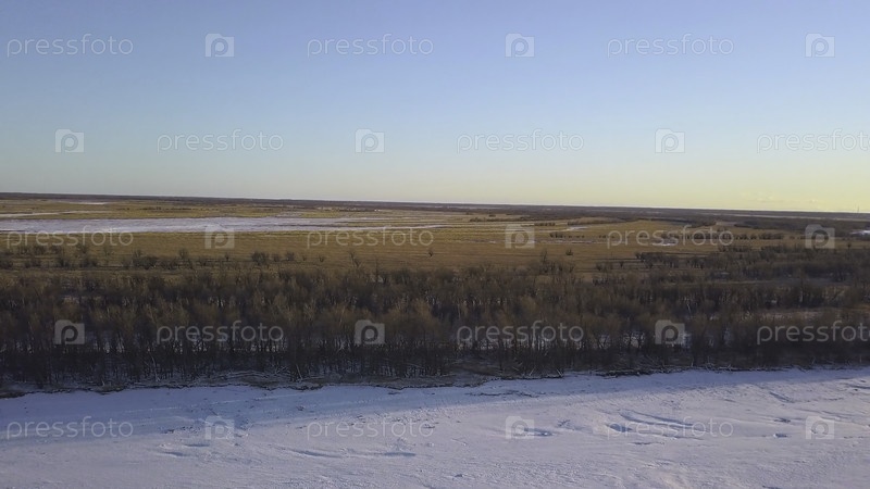 Панорамный пейзаж равнины с лесом и снегом с горизонтом в солнечный день. Леса, луга и равнины со снегом в солнечный весенний день