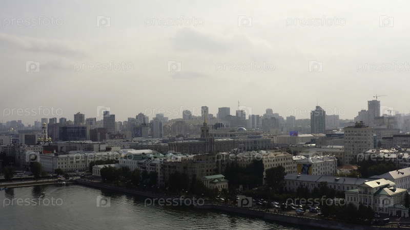 Панорама города с красивой архитектурой и рекой в солнечный день. Стоковые кадры. Красивый современный город с рекой в солнечный летний день. Городской пейзаж с панорамой и современными зданиями