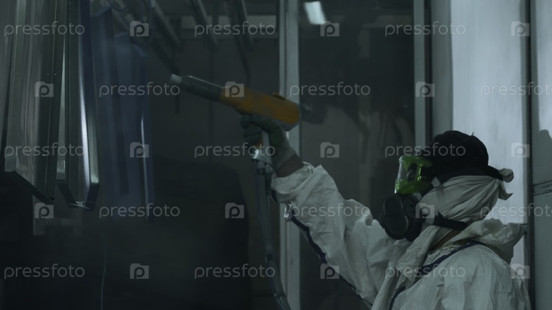Мужчина-техник воздушное окрашивание металлических деталей на промышленном заводе.Креативное.Процесс промышленных распылительных красок