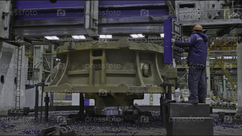 Работник с дистанционным управлением и вращающимся токарным станком. Скотч-клип. Рабочий с панелью управления для фабричных металлообрабатывающих машин. Поворачивающая карусельная машина для металлической обработки