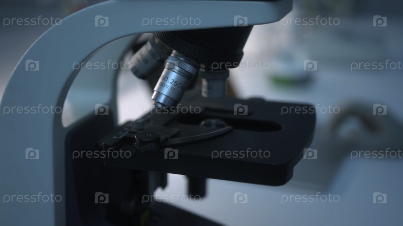 Близкий снимок автоматизированного научного лабораторного микроскопа, осматривающего образец