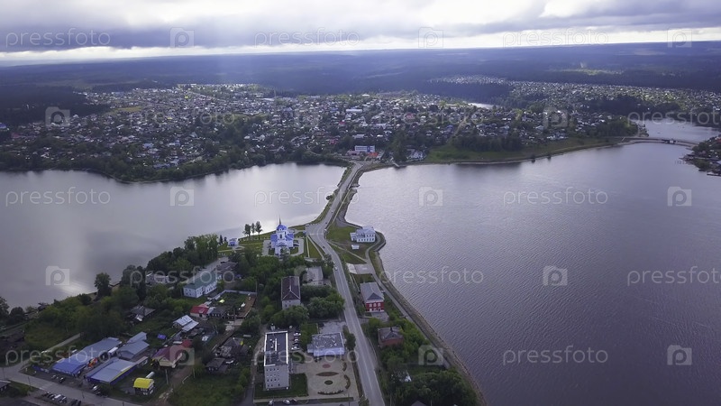 Вид сверху дороги через реку в городе. Клип. Красивый пейзаж города, разделенный проливом на сухопутную автомагистраль. Автомобиль, соединяющий городской пролив летом