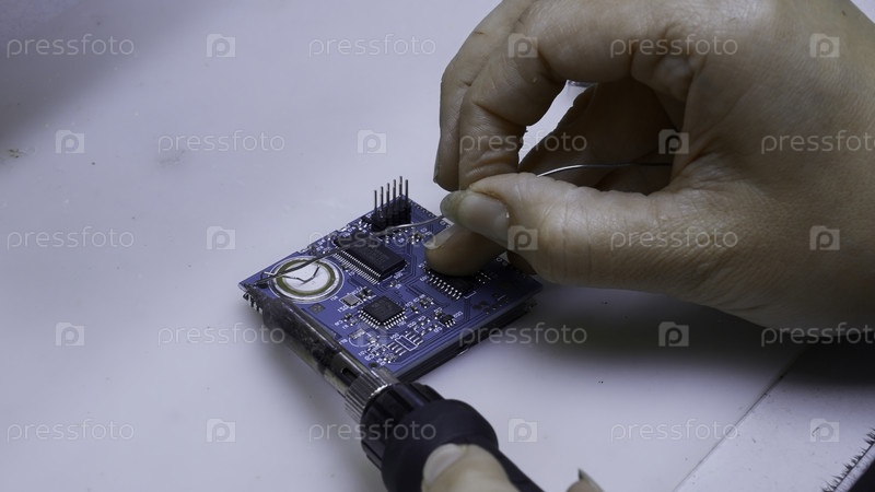 Молодой человек, ремонтирующий компьютерные компоненты в сервисном центре.Креативно.Закрытие сварки чипа