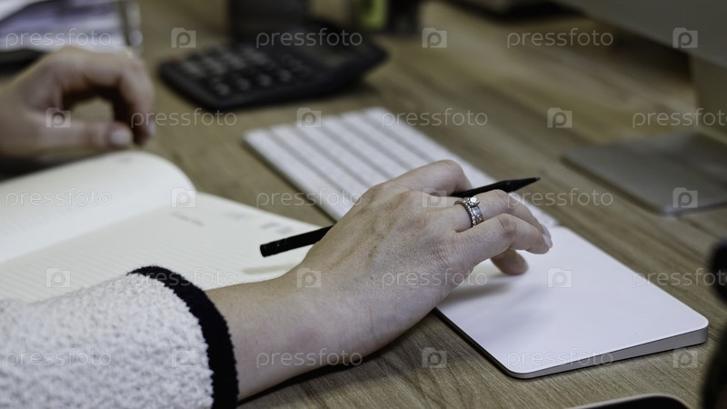 Близкий план элегантной женской руки с кольцом на пальце, печатающей на белой клавиатуре.СМИ.Режиссер работает у компьютера