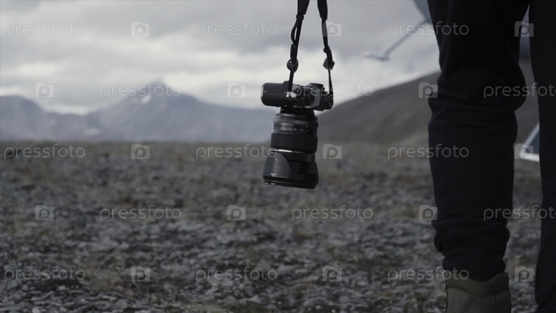 Фотограф несет камеру в природе Клип кинематографический снимок фотографа, идущего с камерой