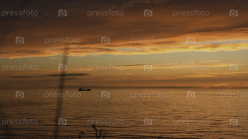 Красивый морской пейзаж с закатом солнца и кораблем на горизонте. Клип. Великолепный вид на закат моря с красными облаками и кораблем на горизонте