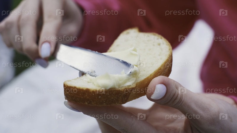 Клубовый снимок женщины, размазывающей масло на хлеб. клип. толстый кусок масла смазывается на кусочек хлеба. женщина готовит сэндвич из масла