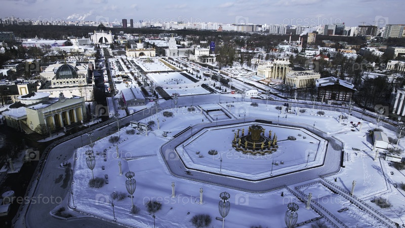 Историческая площадь с фонтаном зимой. креативность. вид сверху красивой площади с фонтаном в солнечный зимний день. историческая площадь советского города с прекрасной архитектурой зимой