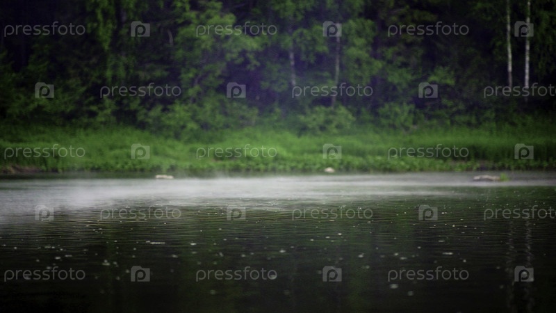 Спокойная и туманная река, украшенная пышной зеленью и окружающей природной красотой