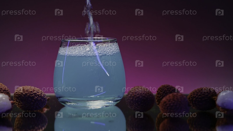 Зеленый коктейль с сиропом. Клип из запасов. Розовый фон со световым фонарем рядом с лежащим личи и налив яркого напитка