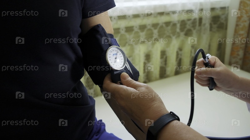 Врач использует механический тонометр для измерения давления тела пациента мужского пола