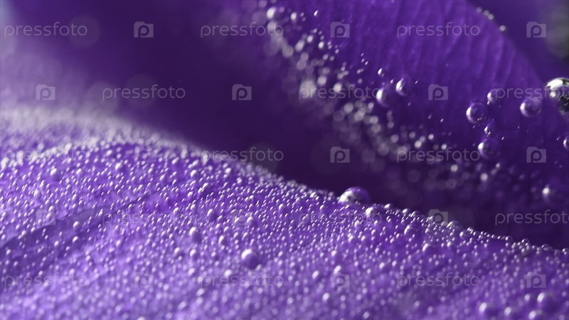 Близкий снимок яркого цветка в воде с пузырями. Стоковые кадры. Фиолетовый цветочный бутон со освежающими пузырями. Небольшие пузыри на лепестках для парфюмерии