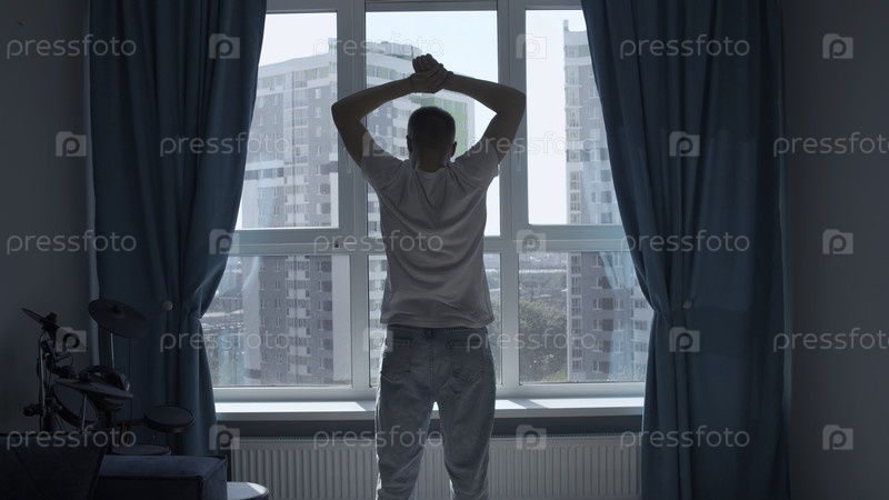 Мужчина утром поднимает руки и растягивается СМИ Молодой человек смотрит в окно на городскую улицу и здания