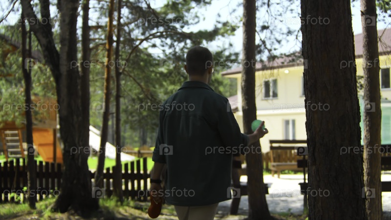 Мужчина с собакой и мячом гуляет в парке. Сток-файлы. Человек бросает собачьего мяча во время прогулки по парку летом. Мужчина ходит с собакой и мячом в солнечный летний день