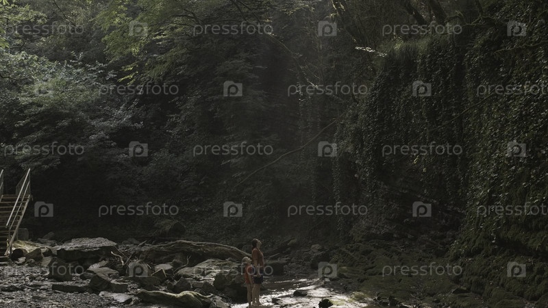 Мама и ребенок смотрят на скалы в лесу летом.Креативно.Мать с мальчиком в лесу со скалами и зелеными деревьями.Семейная прогулка по густому лесному массиву со скалами в солнечный день
