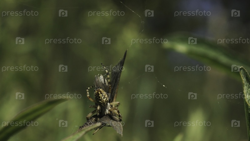 Паук убивает бабочку. творческий. борьба бабочки, попавшейся в паутину. паук борется с бабочкой на летнем лугу. хищники в мире насекомых