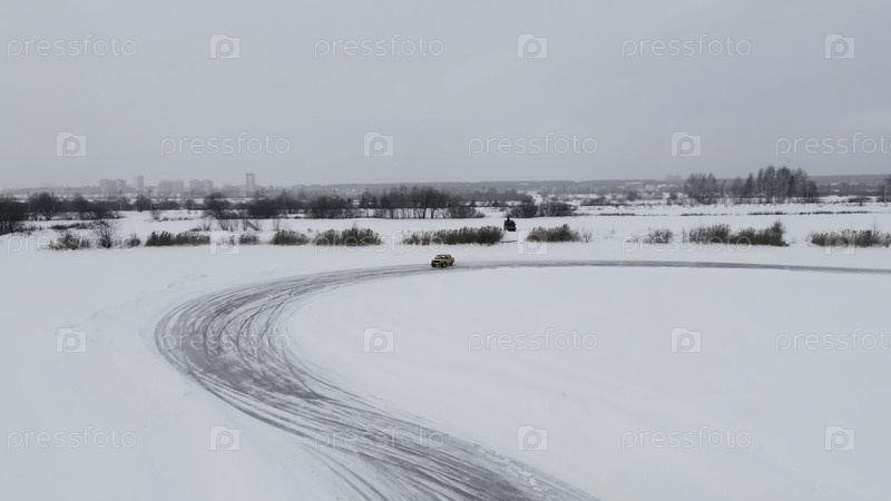 Аэрофотосъемка автомобиля, едущего по заснеженной трассе зимой. Клип. Одна машина едет через ледяное озеро