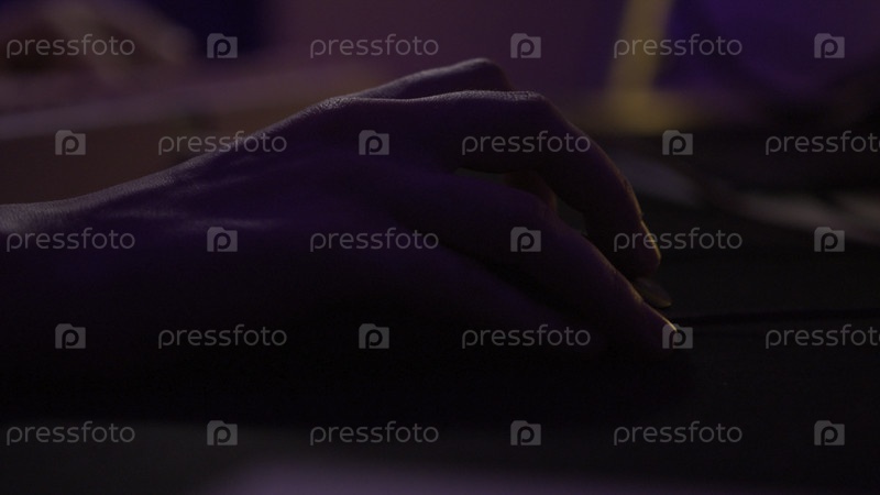 Близкий план человека, играющего в компьютерные игры. Фрагмент кадров. Рука перемещает мышь и нажимает клавиатуру во время компьютерной игры. Игрок движет мышкой и нажимает клавиатуру