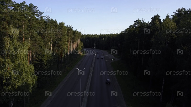 Вид уходящих автомобилей. клип. пейзаж, снятый из вертолета на машинах, которые едут вдоль шоссе возле леса для отдыха. высокое качество 4k кадры