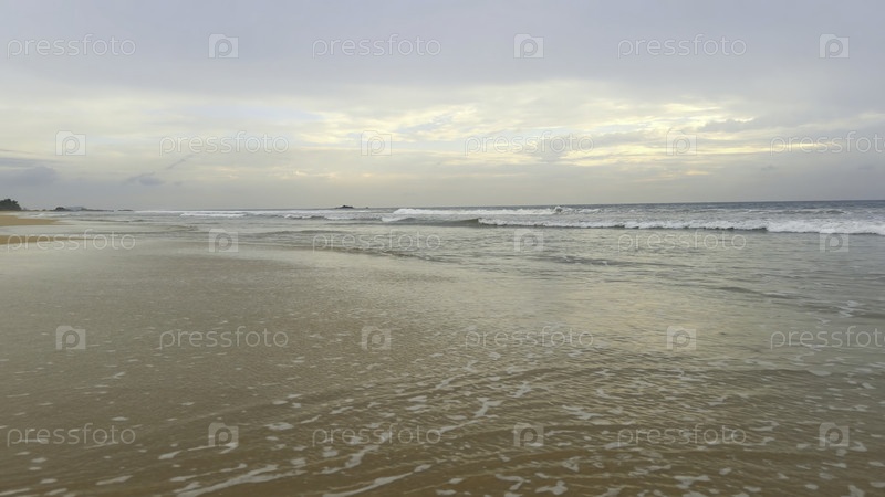 Красивый пейзаж песчаного пляжа с длинными волнами. Действие. Прекрасный тихий пляж с длинными движущимися волнами. Красивый морской ландшафт песчаного пляжа в тропической зоне