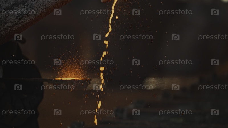 Джет горячего металла разливается на фабрике. Скриншоты. Красивая горячая металлическая жидкость наливается в формы для затвердевания. Металлургическое предприятие с ламповыми потоками металлов
