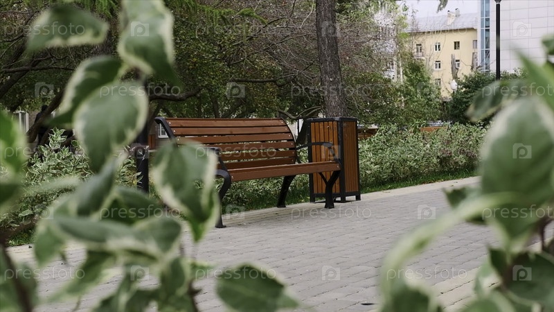 Вид сквозь ветви куста на скамейке. Клип. Размытые ветви кустарника качаются на фоне парковой скамейки. Красивые кусты и растения с скамейкой в жилом саду
