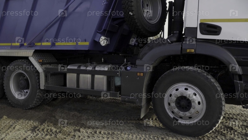 Ближайший снимок колес медленно движущегося грузовика на песчаной поверхности.Сцена.Фон строительной площадки
