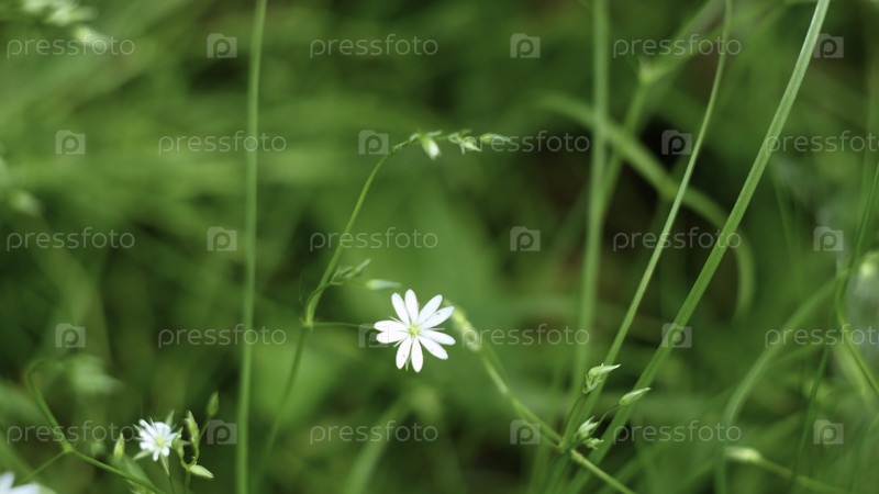 Близкий план зеленой сочной травы и маленьких белых цветов.Концепция.Прекрасная летняя луга в летний день
