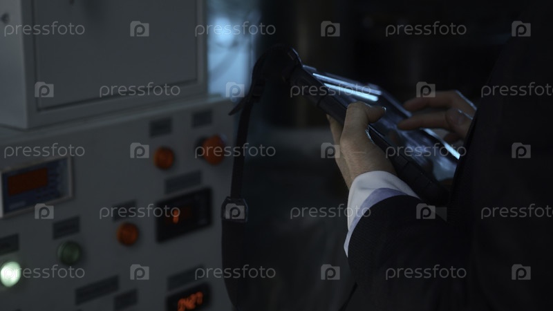 Ближайшее изображение планшета управления промышленным оборудованием. Фрагмент кадров. Человек нажимает на планшет контроля промышленного оборудования. Руководящий инженер устанавливает задачи для оборудования на планшете