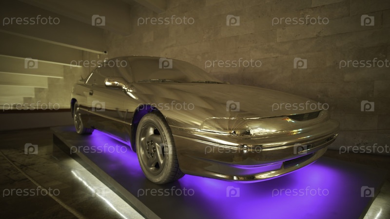 Освещенный автомобиль в салоне выставки. Акция. Крутой автомобиль с позолоченным и подсветленным дном. Неоновое освещение из нижней части автомобиля и золотая краска. Автосалон