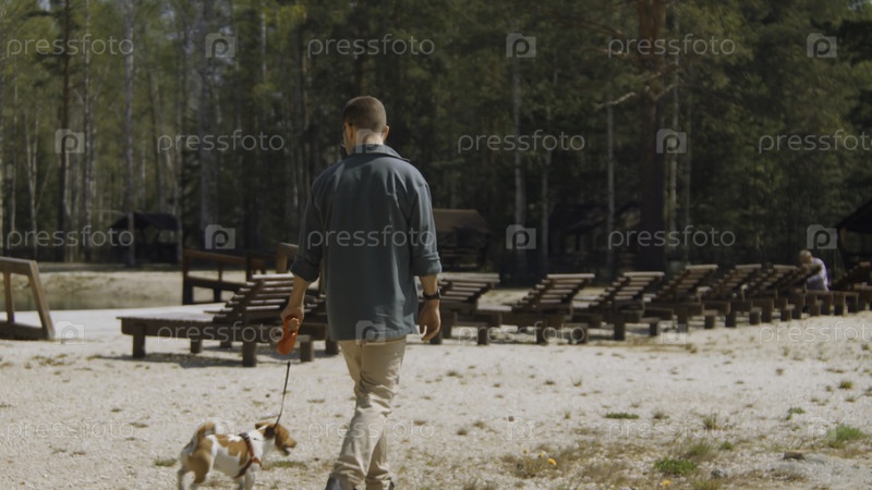 Мужчина гуляет со своей собакой на пляже в лесу.Сток-файлы.Мужчина прогуливается со своей собакой по песку на курорте летом.Мужчина и его собака ходят на берегу пруда в лесу солнечным летним днем