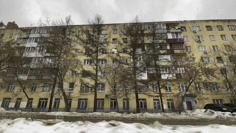 Вид из окна водящего автомобиля в городе зимой. Клип. Путешествие по городу в пасмурный зимний день. Грязный зимний город с панельными жилыми зданиями