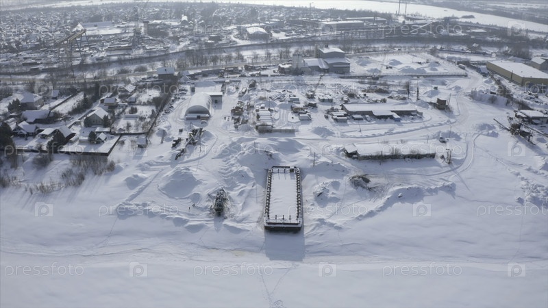 Индустриальный город на берегу реки зимой. Клип. Вид сверху города с морской промышленностью возле берега реки. Морский индустриальный город у реки в солнечный зимний день