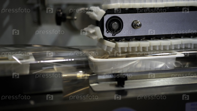 Пластиковая упаковочная машина на производственной линии для упаковки продуктов питания. СМИ. Конвейер с пластиковыми коробками печенья
