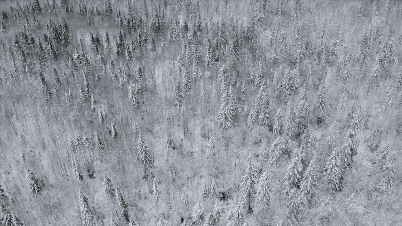 Вид сверху снежно-заснеженного зимнего леса.Клип.Конусовый лес со снежными деревьями в облачный день.Огромный лес со снегом зимой