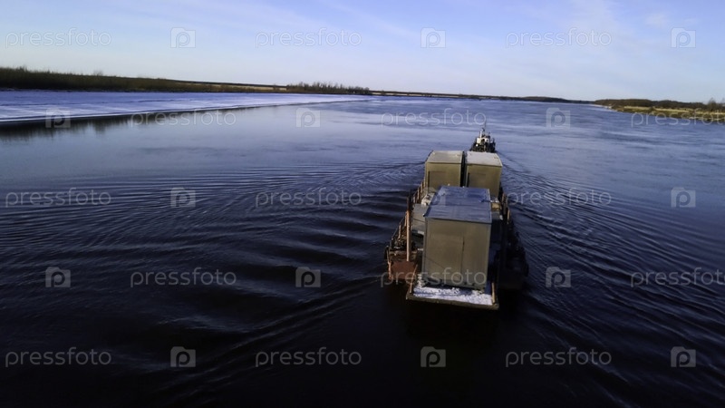 Промышленный фон с баржей и рекой со снежным берегом. Клип. Грузовое судно, перевозящее грузы на полевом фоне
