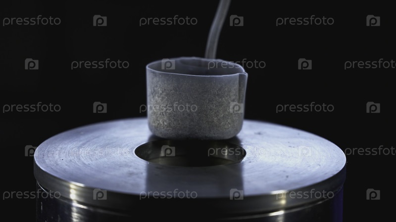Нагревающее ведро на баке. Снимок запаса. Ведра с ручкой удаляется из горячего резервуара. Водонагревательный бак для горячей воды с ведром для орошения