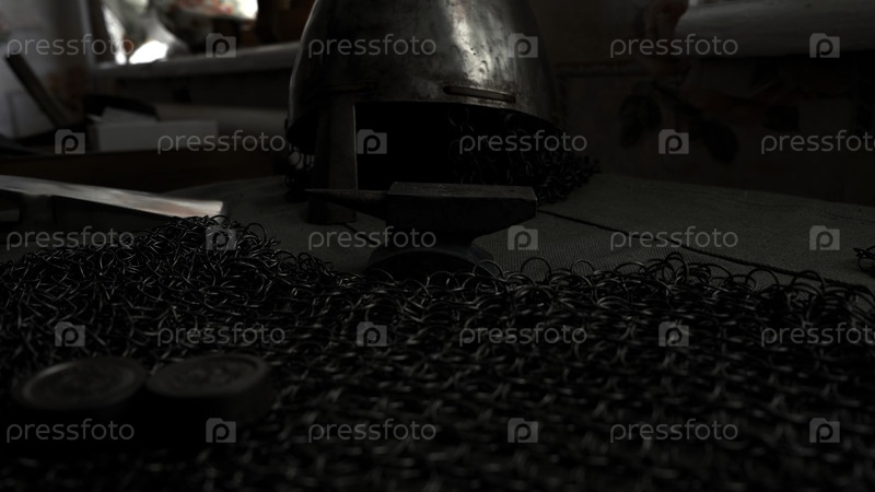 Древние русские украшения. СМИ. Стол с большим мечом и железным шеломом, который
